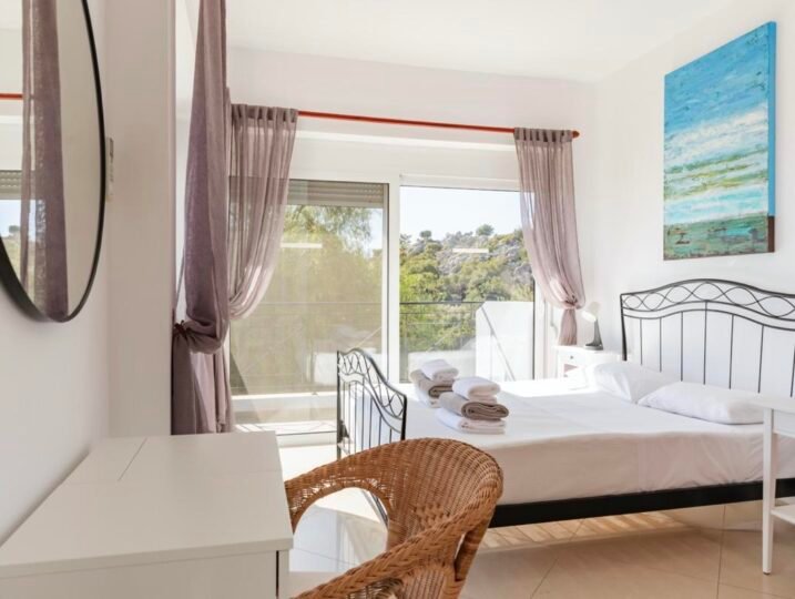 Upstairs, the spacious master bedroom includes an en-suite bathroom with a shower, while a second bathroom with a bathtub serves the additional bedroom featuring two single beds. All rooms have floor-to-ceiling windows that open to balconies or the expansive roof terrace, offering breathtaking views of the sea and surrounding landscapes. For added comfort, all windows are equipped with external roller shutters and insect screens.