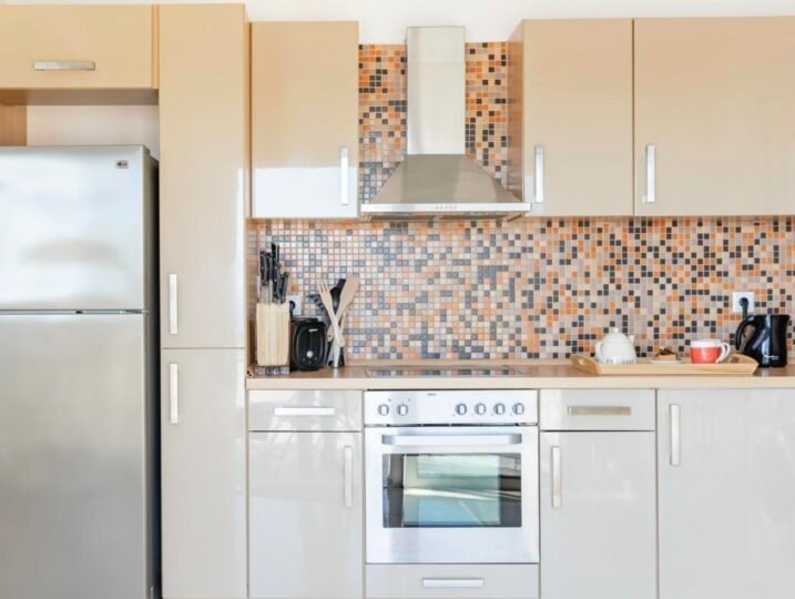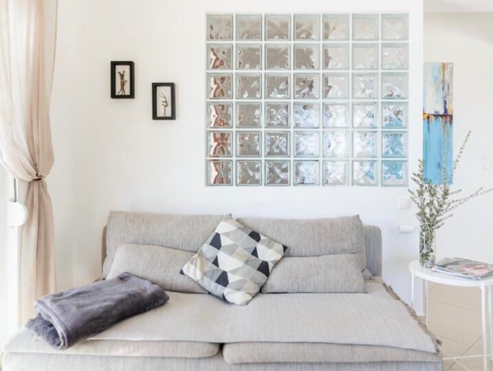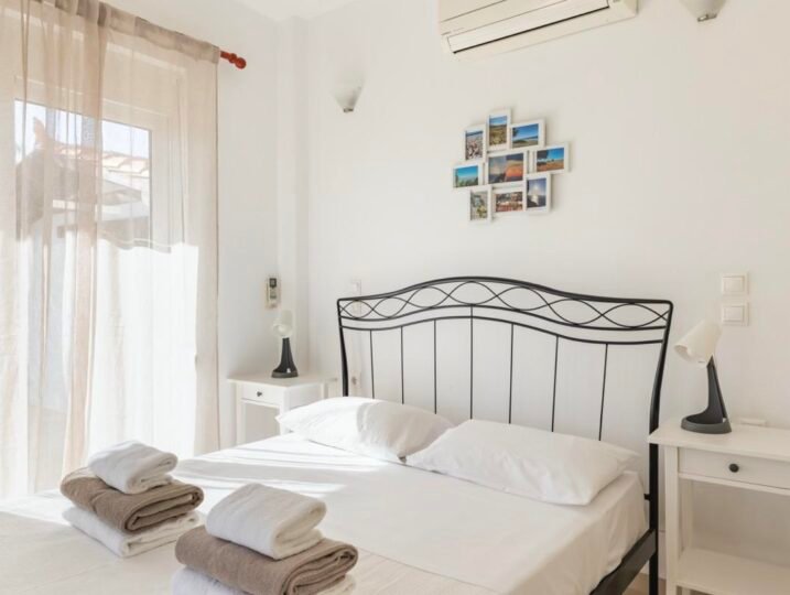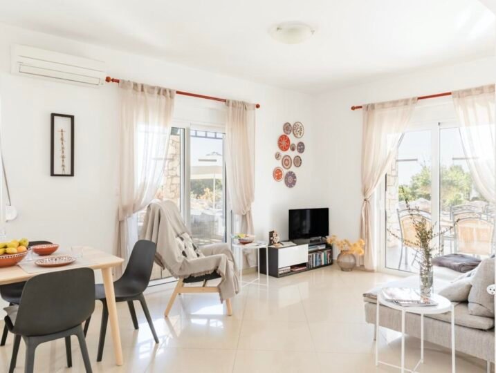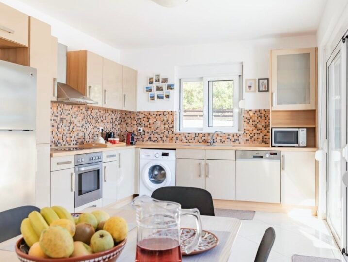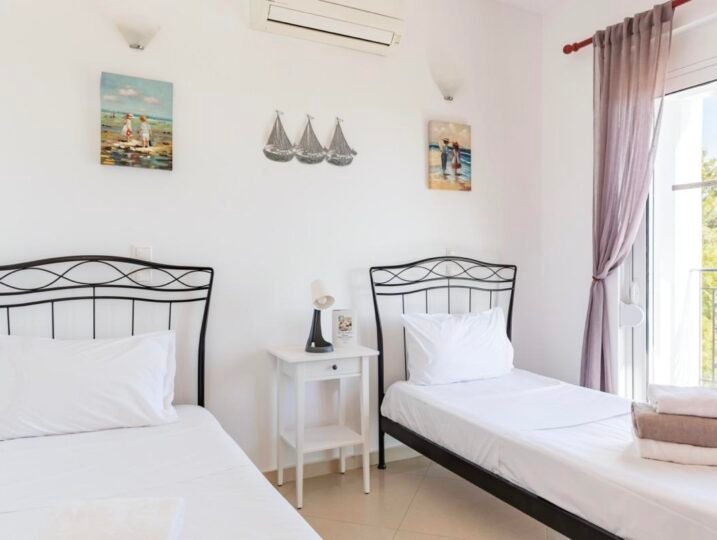 The villa is thoughtfully designed for comfort, with air conditioning throughout to ensure a cool and pleasant stay during the warm summer months. On the ground floor, you’ll find an open-concept, fully equipped kitchen, a cozy dining area, and a comfortable living room. A double bedroom with floor-to-ceiling windows offers stunning views and direct access to the garden, while a modern bathroom with a shower is conveniently located nearby.
