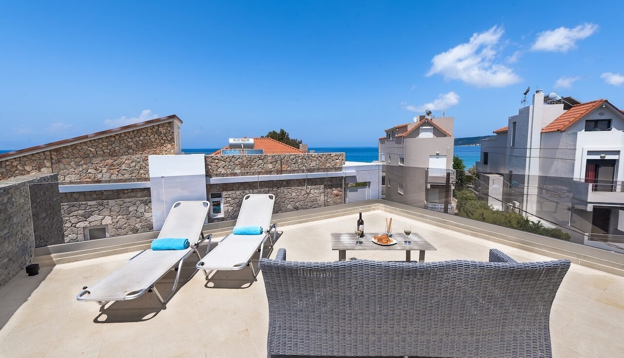 The villa’s living areas extend seamlessly to the outdoors, blurring the boundary between interior comfort and the majestic Mediterranean landscape. The private terrace and infinity pool appear as a liquid extension of the cerulean sky, creating a breathtaking vantage point from which to contemplate the panoramic vistas of the rolling hills and the sparkling Ixia Bay. It is a stage for sublime sunsets and starlit evenings, perfect for al fresco dining or contemplative solitude.