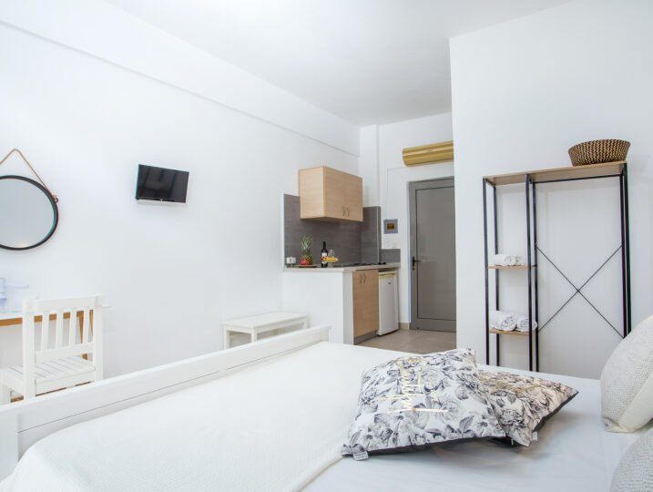 Each of our 11 studios is designed to offer the perfect blend of style and functionality, ensuring a comfortable and memorable stay. With modern amenities such as en-suite bathrooms, private balconies to soak up the Greek sunshine, and fully equipped kitchenettes, every detail is tailored to ensure your stay is as comfortable as it is memorable.