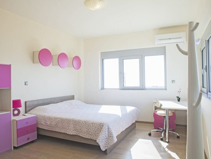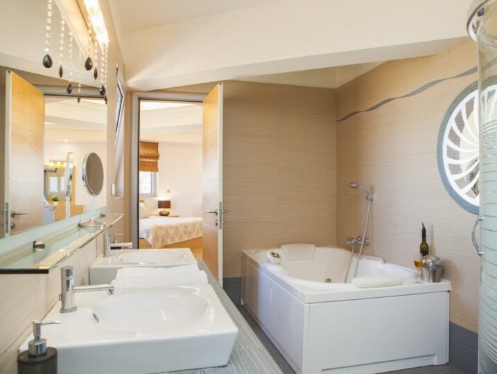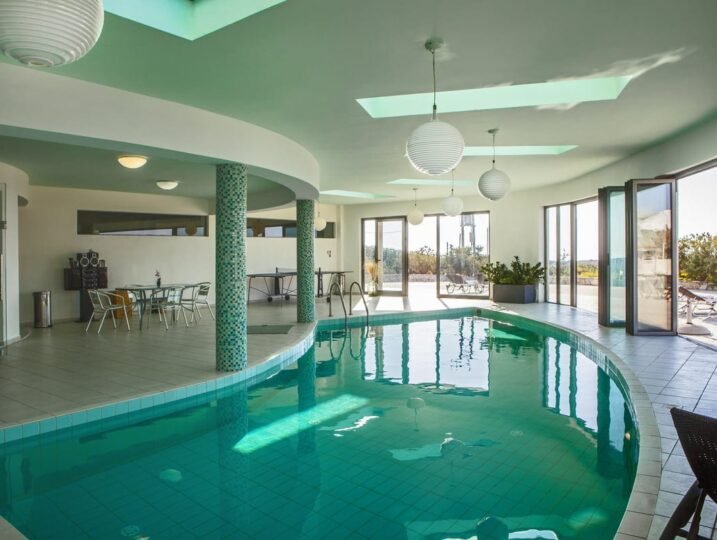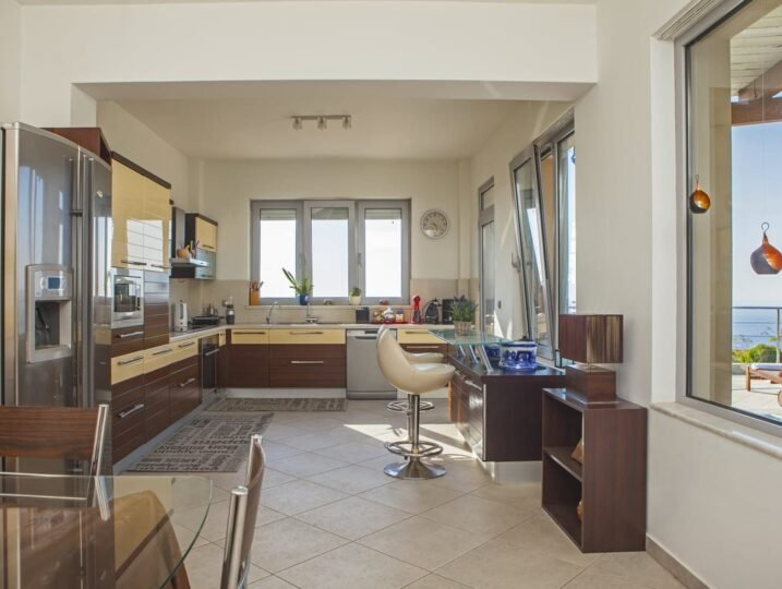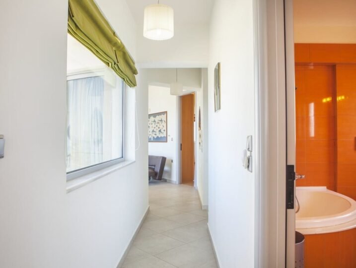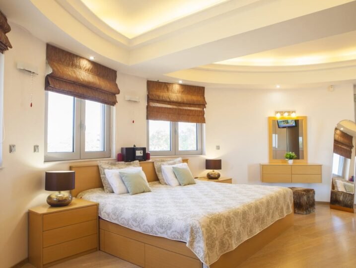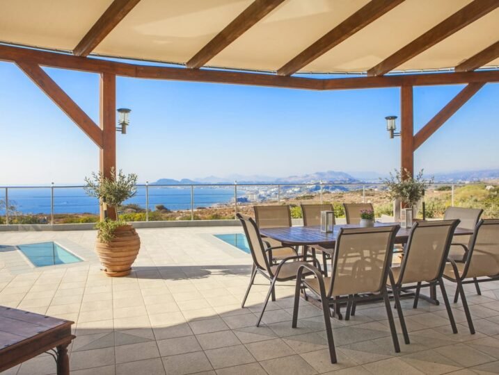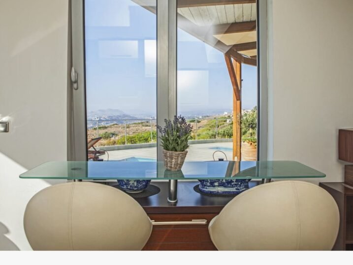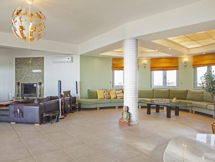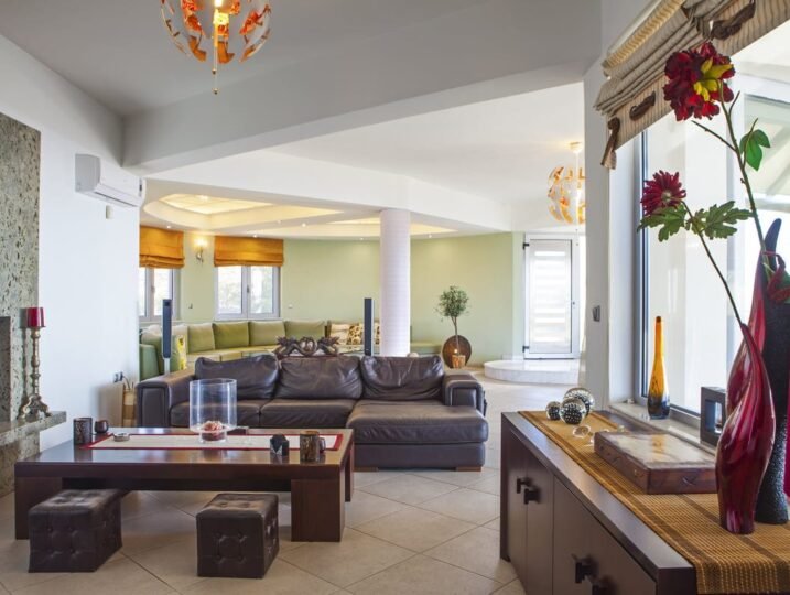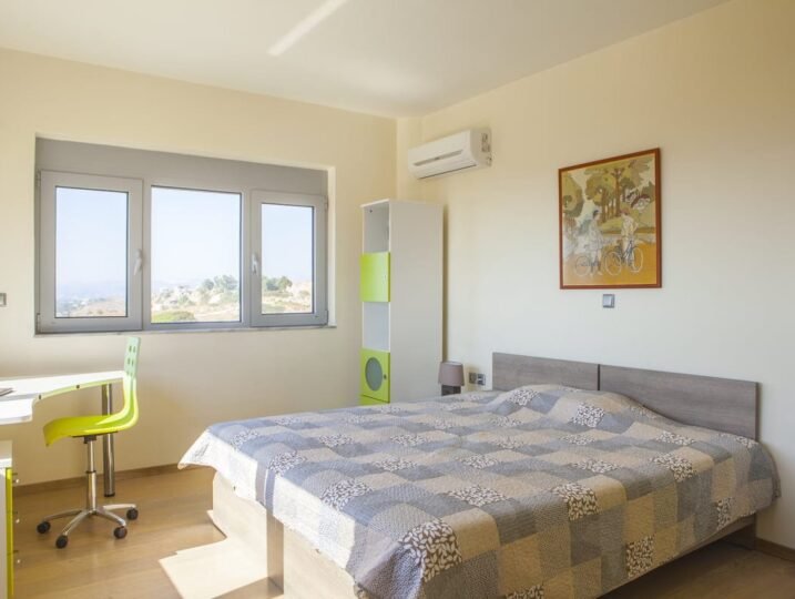 The villa is centrally located between Rhodes town – and Faliraki – each way  6 km. A gravel road leads to the house and is not tarred. An ideal base from which to explore the beauty of the island and the Kalithea Bay is right on the doorstep. Each of the 5 bedrooms has a sea view and the master bedroom additional to Rhodes town. The main entrance leads to  the first floor with a comfy sitting round sofa area and invites you to relax,to dine on a separate table or next to  the fully equipped kitchen .You will find ocean view in all the rooms ,a second leather sofa lounge with TV – surround system and another WC. The master bedroom has a walk-in closet and en-suite bathroom , TV and is located on the second  floor with another 2 bedrooms,1 bathroom ,a lounge with a balcony and a laundry space. On the groundfloor  next to the pool is another living room, 1 bedroom with en-suite bathroom (shower) and 2 double beds (separated with fabric blinds). The villa is fully air conditioned, luxuriously equipped with all kinds of electrical appliances, TV flat screens with surround system, SAT and free Wi-fi. The pool area is with sliding doors, so you have an indoor and outdoor pool, which can be heated if necessary (winter surcharge 50 € / day).A car rental is manadatory and a dirt road leads to the villa.