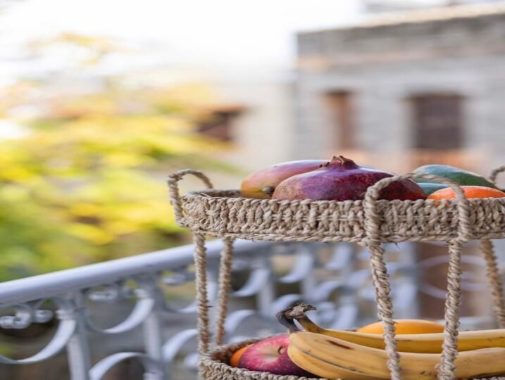 Upstairs, the bedroom invites you with its in-built antique wardrobe and a comfortable 1.60 x 2.00 bed. The room opens onto a private balcony, ideal for sipping your morning coffee while taking in the vibrant neighborhood. The air-conditioned bedroom also features satellite TV and wooden floors that enhance the warm and inviting ambiance, while several windows fill the space with natural light.