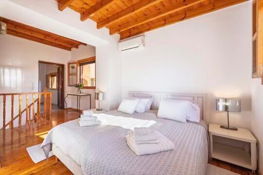 Upstairs, you’ll find an open bedroom furnished with a king-size bed, air conditioning, and a wardrobe. The adjoining bathroom is beautifully appointed with a round bathtub, a bidet, and a built-in cabinet with a sink. Convenience is key, with a washing machine and a fully equipped kitchen ensuring a hassle-free stay. Entertainment options include a TV with satellite channels and air conditioning on the upper floor for year-round comfort.